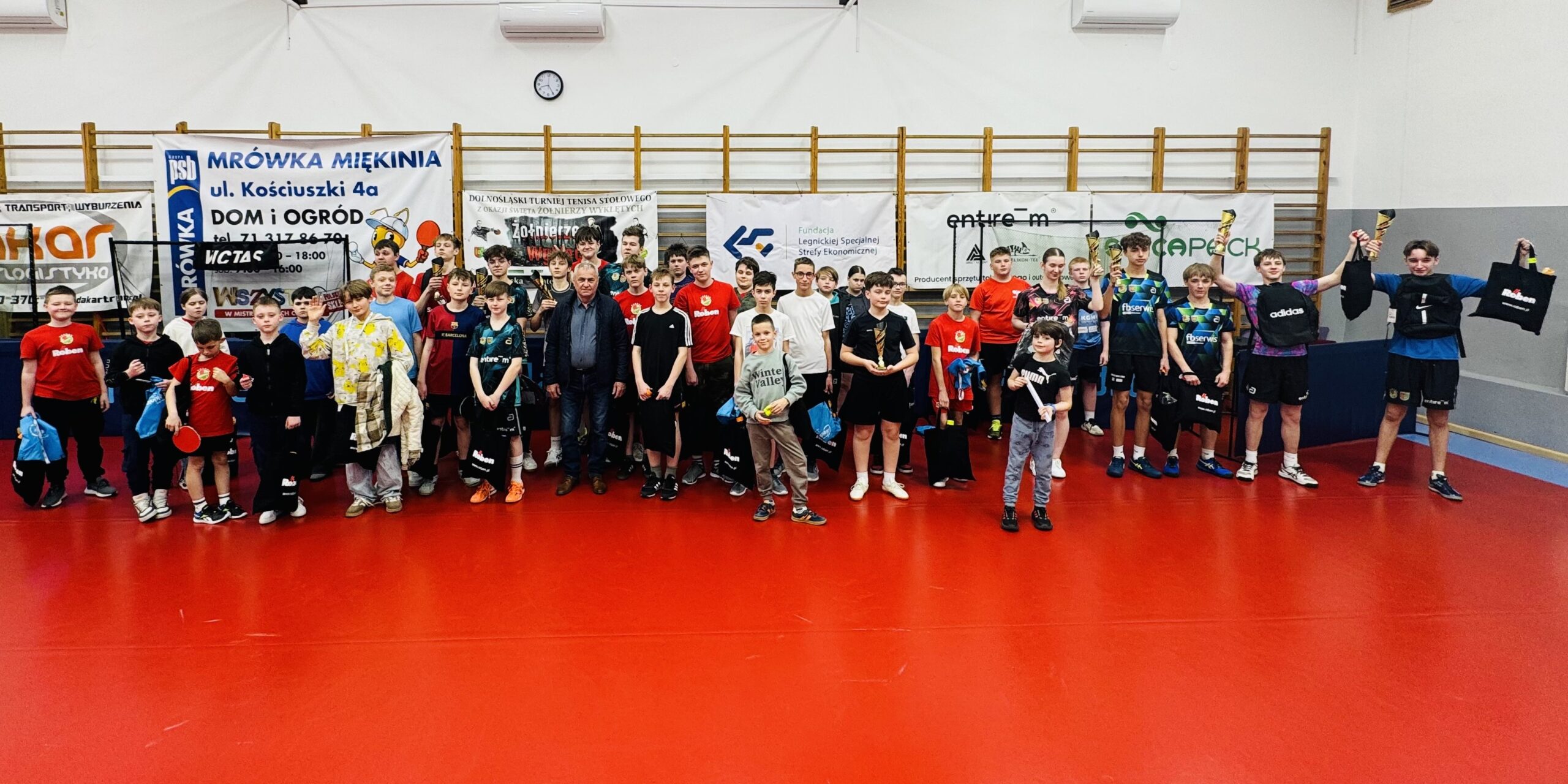 W trzeci marcowy piątek, 27.03.2026 r., w Sali Sportowej Głosce odbył się drugi tegoroczny Turniej tenisa stołowego dla dzieci i młodzieży. Tym razem przy rekordowej frekwencji spowodowanej zapewne piękną wiosenną pogodą , 52 młodych adeptów plastikowej piłeczki ze szkółek tenisowych w Lutyni, Miękini, Pisarzowic i Głoski z terenu Gminy Miękinia oraz z zaprzyjaźnionej sekcji ts w Ciechowie – zawitało do gościnnej Głoski, ażeby uczcić Wiosenne Święta Żołnierzy Wyklętych na Pingpongowo. Sponsorem głównym turnieju był Burmistrz Miasta Miękinia, sponsor projektu pn „Z PINGPONGEM NA CO DZIEŃ 2026” oraz Fundacja Legnickiej Specjalnej Strefy Ekonomicznej w Legnicy, sponsor projektu pn „Nadodrzański Piknik Patriotyczno-Sportowy 2026”. Ponadto nasz turniej wspierali: PZTS w Warszawie, sponsor projektu PINGPONGOWE MARZENIA, Fundacja KGHM Polska Miedź z Lubina, sponsor projektu pn. MIEDZIOWE PINGPONGI 2026, jak również nowopowstała Firma PEPSICO Środa Śląska, która przekazała dla naszych dzieci wyprodukowane w pobliskich Komornikach znakomite chipsy. Piękne puchary oraz gadżety promocyjne dla najlepszych zawodników ufundował Burmistrz Miękini, Pan Jan Marian Grzegorczyn, które w zastępstwie wręczał Radny Gminy Miękinia i Sołtys Głoski, Pan Janusz Waśniewski . Patronem turnieju były Firmy wspierające nasz Klub: ROEBEN Ceramika Budowlana ze Środy Śląskiej, która z okazji pięknego jubileuszu 30-lecia nawiązania współpracy sponsorsko-reklamowej przekazała koszulki okolicznościowe dla wszystkich dzieci i młodzieży ze szkółek terenu Gminy Miękinia, Firma Pana Romana Jędrzejczyka spółka komandytowo-akcyjna z Lutyni, VERPA FOLIE z Krępic, Firma SAICA PACK Wrocław Sp.z.o.o. z Krępic, ELDISY Polska Sp.z.o.o. ze Środy Śląskiej, WAGO ELWAG Sp.z.o.o. z Wróblowic i Wrocławia, ALBA Polska Sp.z.o.o., AKS INVEST PIOTR SŁUGOCKI z Wrocławia, SODA PLUSS z Krępic dzięki której dzieci mogły skosztować hot dogów, HMT Metalltechnik,VVan Jan Grabowski, AUTOMAX Jacek Sługocki z Głoski, Rajkowski Budownictwo z Lutyni EntireM, Helikon – Tex,Uzdrowiska -Kłodzkie, Grupa PGU, darczyńca doskonałej wody mineralnej STAROPOLANKA.Dzięki ich hojności wszystkie dzieci i młodzież uczestniczące w zawodach otrzymały paczki ze słodyczami. Ponadto pomoc rzeczową w formie napoi, ciastek, pizzy przekazali nasi stali darczyńcy : Piekarnia Paweł Wiśniewski ze Ścinawy, PPHU „Głoska” Hreczuch Katarzyna z Głoski, Sklep Małgorzaty GRZYB z Głoski, PIZZERIA ANNA z Brzegu Dolnego oraz nasz niezawodny sponsor indywidualny Pan Tomasz SZARZYŃSKI . Bardzo się cieszymy, że do grona sponsorów naszego Klubu dołączyła Fundacja LSSE z Legnicy, która przekazała nagrody rzeczowe w postaci sprzętu do tenisa stołowego, plecaki ADIDAS, dla sześciu najlepszych uczestników. Ponadto Prezes PZTS , Pan Dariusz Szumacher, przekazał 8 nagród rzeczowych w postaci sprzetu Firmy TIBHAR oraz Pani Bożena Waldowska, właścicielka Firmy sprzętowej ANDRO, która przekazała 8 par skarpet dla naszych najmłodszych uczestników.Również Prezes UKS Gminy Miękinia, Pan Prezes UKS GMINY Miękinia , Grzegorz Herbuś udzielił wsparcia finansowego na zakup słodyczy. Nasze cykliczne atrakcyjne turnieje indywidualne nie byłyby możliwe bez rozsądnej polityki w zakresie sportu młodzieżowego, którą wspiera Burmistrz Miękini, Pan Jan Marian Grzegorczyn. System powszechnego wspierania sportu dzieci i młodzieży w Gminie Miękinia poprzez UKS Gminy Miękinia i kierowanie najzdolniejszej młodzieży do Ośrodka w Głosce, przynosi doskonałe efekty, których potwierdzeniem są sukcesy naszej młodzieży.Bardzo pięknie dziękujemy Dyrektor Samorządowego Ośrodka Kultury w Miękini, Pani Małgorzacie Sidorskiej-Sujeckiej za pomoc i życzliwe udostępnienie obiektów w Głosce.Wszyscy młodzi pasjonaci pingponga z niecierpliwością czekają na kolejny w tym roku,trzeci z kolei jesienny turniej z okazji Święta Dnia Dziecka.
